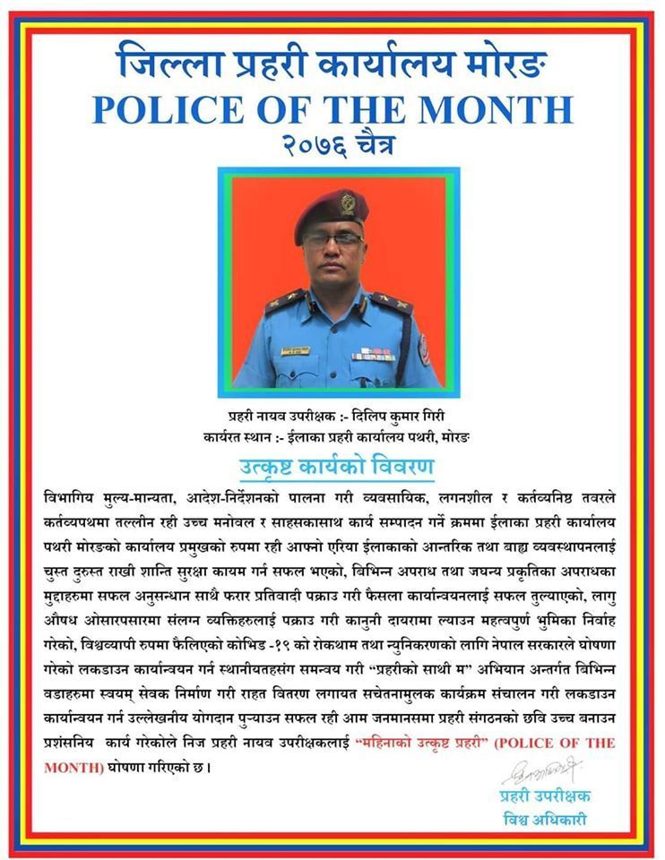 पथरीशनिश्चरे । इलाका प्रहरीकार्यालय पथरीका प्रहरी नायव उपरीक्षक (डिएसपी) दिलिप कुमार गिरी चैत्र महिनाको उत्कृष्ट प्रहरी (BEST POLICE OF THE MONTH) घोषीत भएका छन् । जिल्ला प्रहरी कार्यालयले गिरीलाई उत्कृष्ट प्रहरी भएको घोषणा गरेको हो ।