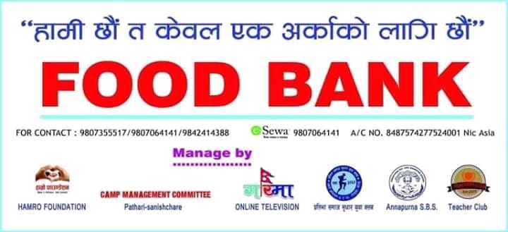हामी छौं त केवल एक अर्काका लागि छौं’, ‘सकिन्छ मुठी खोलौं, सकिदैन लिएर जाउँ’ भन्ने मुल नारा रहेको अभियानमा गरिमा अनलाइन टेलिभिजन, हाम्रो फाउण्डेशन, भूटानी शिविर व्यवस्थापन समिति, प्रतिभा समाज सुधार युवा क्लब र पथरीशनिश्चरेको व्यवस्थापनमा सो ‘फुड बैंक’ सञ्चालनमा ल्याइएको हो। जुन अभियान देखेर देश तथा बिदेशबाट निरन्तर सहयोग जुटिरहेको छ।