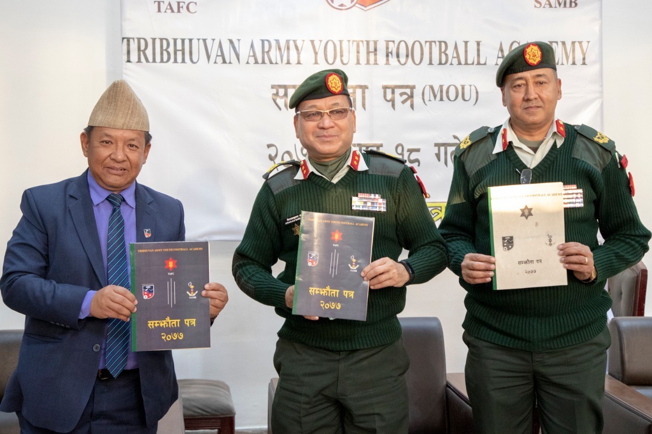 काठमाडौं । फुटबल एकेडेमी संचालनको लागि अखिल नेपाल फुटबल संघ (एन्फा) र त्रिभुवन आर्मी क्लबबीच सम्झौता भएको छ । सैनिक आवासीय महाविद्यालयमा एकेडेमी संचालनको लागि एन्फाले आइतबार आर्मीसँग सम्झौता गरेको हो ।