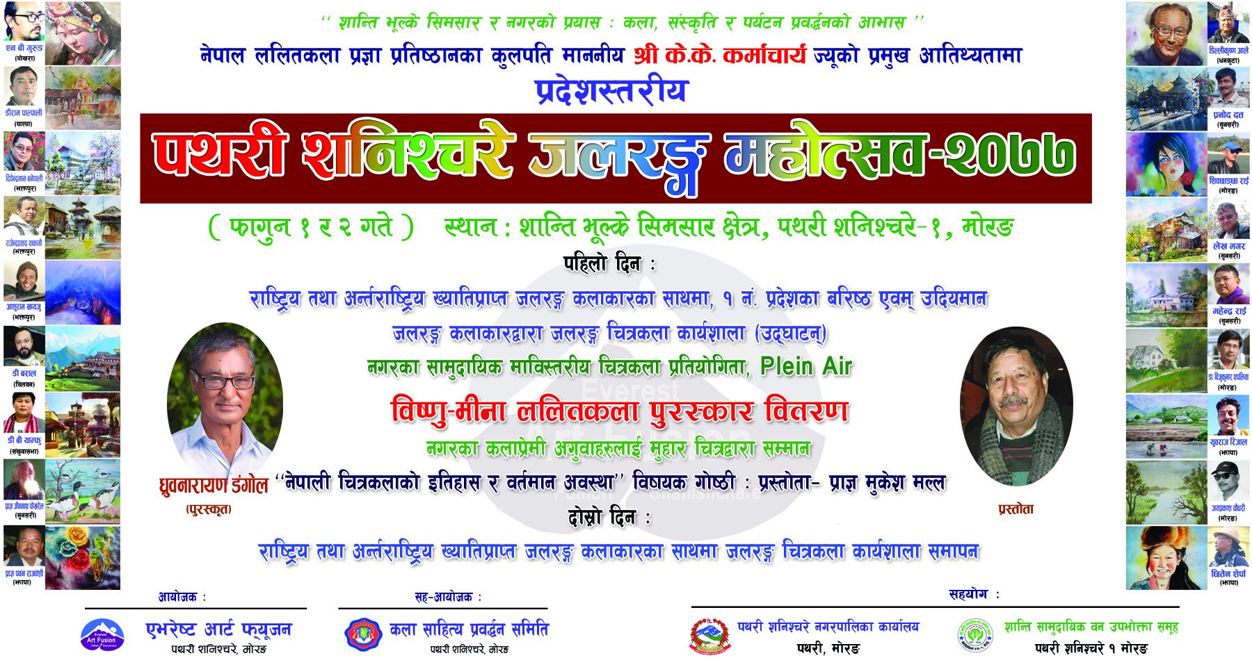 तिनै कलाकारहरु फागुन ४ गते विरानगरमा ‘विराट राजदरवार: इतिहास उजागर ’ भन्ने मर्मका साथ चित्रकला काब्यशालामा सहभागि हुने छन् । विराटनगर महानगरपालिका कार्यालयको सहयोग र ललितकला संगमको सहकार्यमा विराट राजाको ऐतिहासिक दरबार रहेकोस्थल विराटनगर १८ मा एभरेष्ट आर्ट फ्यूजनले नै सो कार्यक्रम गर्ने भएको छ ।