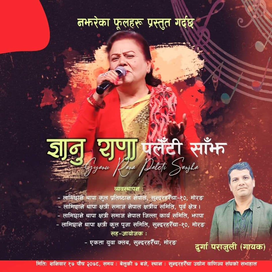 विपुल सुवेदी ~ सुन्दरहरैँचा सुन्दरहरैँचाको विराटचोकमा ‘ज्ञानु राणा पलेँटी साँझ २०७८’ को आयोजना हुने भएको छ । आगामी पौष १७ गते शनिवार सुन्दरहरैँचा उद्योग वाणिज्य संघको सभाहलमा कार्यक्रमको आयोजना गरिने भएको हो ।